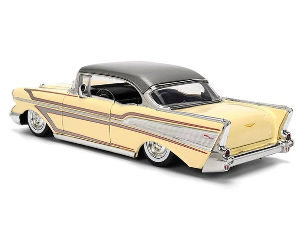 - Brand new 1/24 scale diecast car model of 1957 Chevrolet Bel Air Cream with Graphics and Gray Metallic Top "Bigtime Muscle" Series die cast model car by Jada.