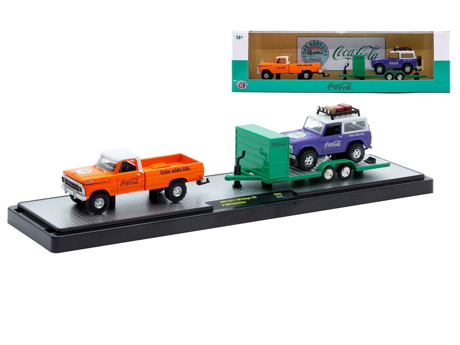 - 3) 1969 Ford F-100 Ranger 4X4 Pickup Truck Orange with Gray Top and 1966 Ford Bronco Purple with White Top and Roofrack with Flatbed Trailer "Coca-Cola".