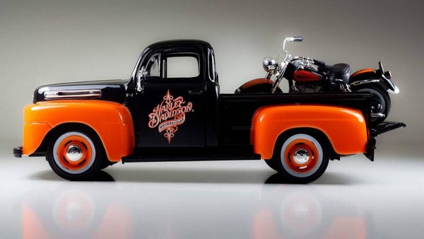 - Brand new 1/24 scale diecast car model of 1948 Ford F-1 Pickup Truck with 1958 Harley Davidson FLH Duo Glide Motorcycle Orange and Black die cast model car by Maisto.