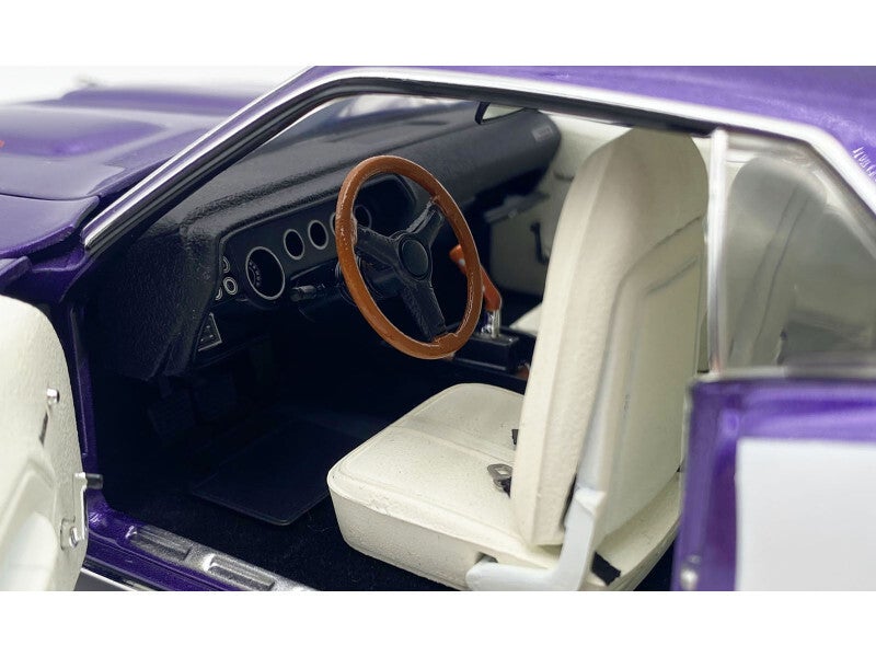 There’s little doubt that the 1971 Hemi 'Cuda is the Holy Grail of muscle cars! It’s the one muscle car that stands out for being the first American muscle car to demand north of the million dollar mark at auction (in 2014). But the status of the Hemi Cuda is not new; it has long been lusted for as a legendary muscle car with sinister looks and the power to back it up. First, yes, it's In Violet paint (commonly referred to as Plum Crazy), that wild and eye-grabbing '70s pop-culture hue that practically defined Mopar performance machinery. Both models have white seating and door panels with black dashboard and carpet. Under the hood you'll find the 383 Big Block Wedge powerplant which was designed to be a great combination of thrift and performance. Few Detroit muscle machines had the same impact as the 1971 Cuda with lightning acceleration, flamboyant paint and styling.