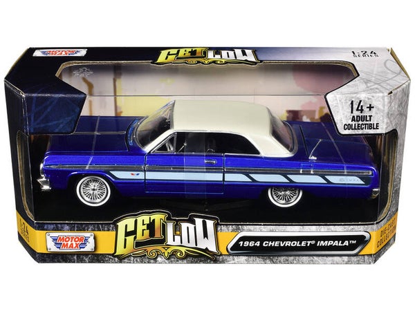 - Brand new 1/24 scale diecast car model of 1964 Chevrolet Impala Lowrider Hard Top Candy Blue Metallic with Cream Top "Get Low" Series die cast model car by Motormax.