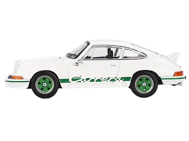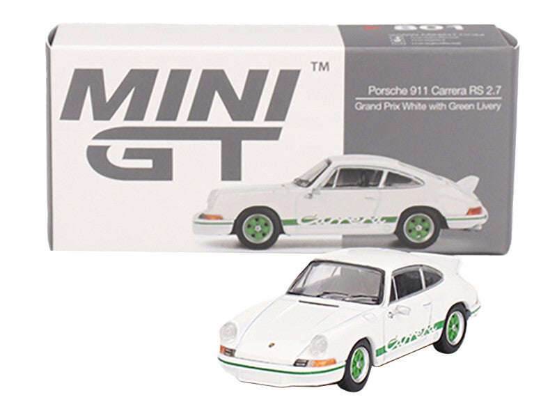 - Brand new 1/64 scale diecast car model of Porsche 911 Carrera RS 2.7 Grand Prix White with Green Stripes and Wheels Limited Edition die cast model car by Mini GT.