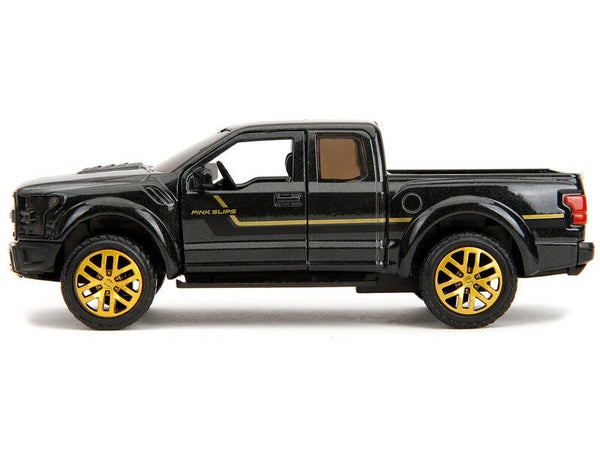 - Brand new 1/32 scale diecast car model of 2017 Ford F-150 Raptor Pickup Truck Black Metallic with Gold Stripes "Pink Slips" Series die cast car model by Jada.